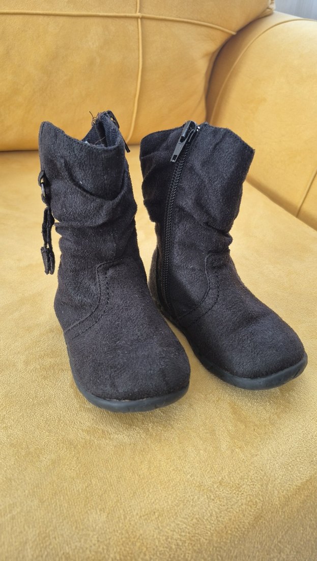 Yumuşak ve süet kumaştan yapılmış, fermuarlı siyah kız bebek botları. Kolay giyim için yan fermuar ve desensiz yüzey içerir.