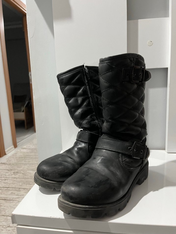 Fermuarlı deri kız çoçuk botu siyah kinetix orijinal 33 numara yırtık herhangi bir sorun yoktur fotoğrafta göründüğü demi kısmının rengi gitti biraz o kadar onun dışında sapasağlam
