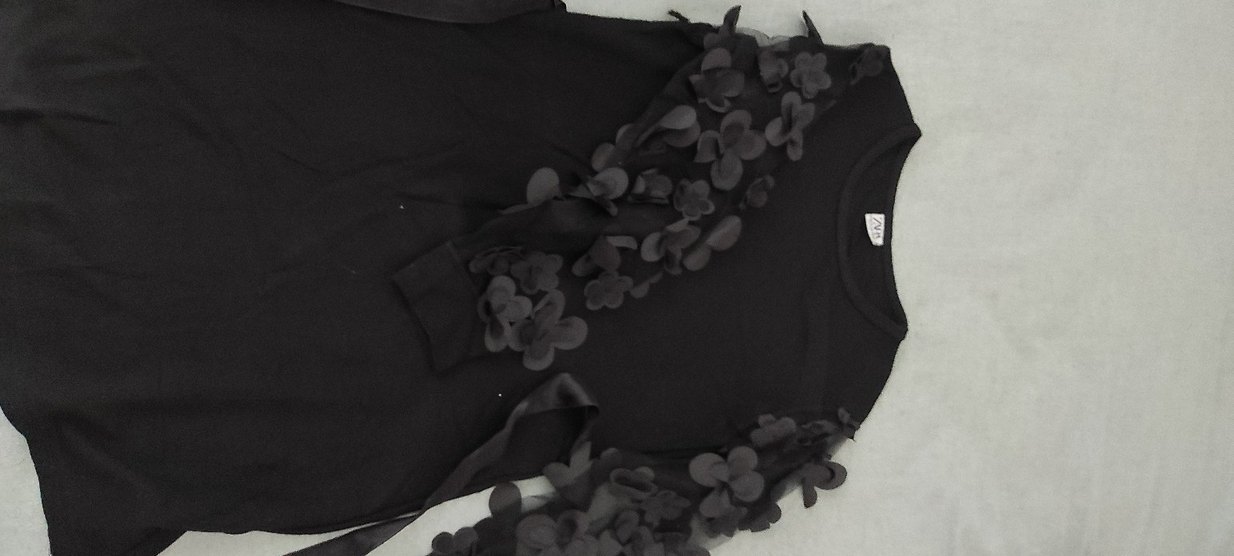 Siyah, nakışlı ve volan detaylı, V yakalı ve uzun kollu kız çocuk elbise.Sentetik kumaştan, gotik tarzda şık bir tasarım.