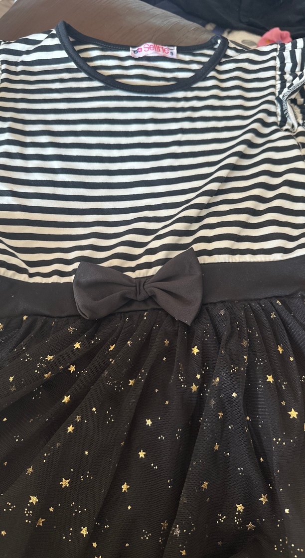 Siyah çizgili üst kısmı ve fiyonk detaylı, oturan kesim kız çocuk eteği. Sentetik kumaş, gotik tarzda ve yıldız desenli. ✨