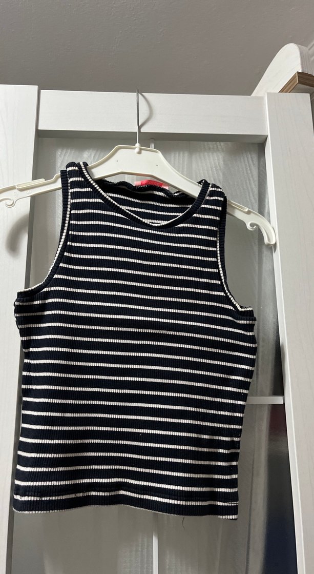 Kız çocukları için kolsuz, yüksek yakalı, siyah beyaz çizgili, sentetik kumaştan yapılmış, dar kesim ve sokak modasına uygun şık bir atlet.