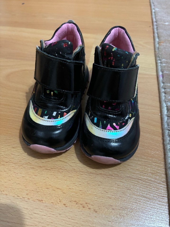 Kız çocukları için siyah ve çok renkli batik desenli, kaymaz kauçuk tabanlı, velcro bantlı spor ayakkabılar. Rugan