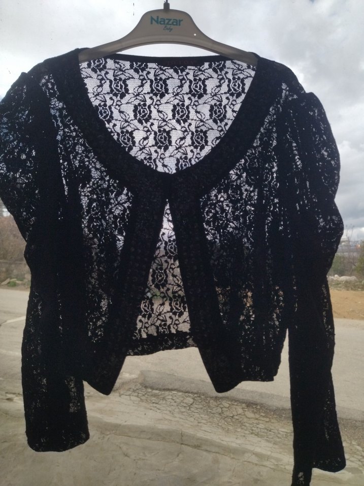 Uzun kollu, dantel detaylı siyah kız çocuk bolero, bohem ve retro tarzlar için ideal, ince örme kumaştan yapılmıştır.