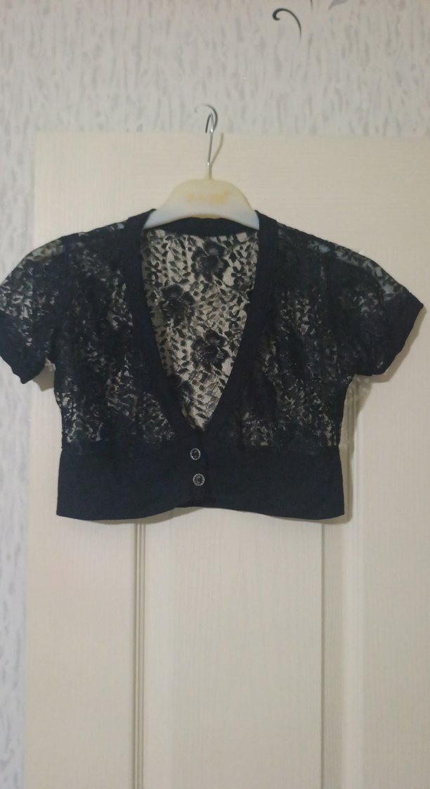 Kız çocukları için siyah, kısa kollu ve V yakalı, dantel detaylı, triko kumaştan yapılmış, dar kesim bolero. dantel tül. açık abiyelerdede kullanilir