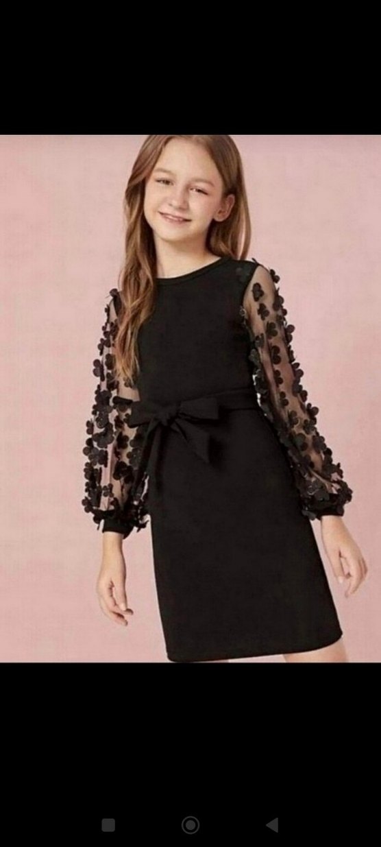 Kız çocukları için tasarlanmış, çiçek desenli dantel uzun kollara ve yuvarlak yaka sahip siyah, vücuda oturan elbise.