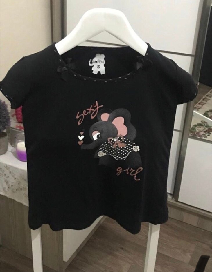 Siyah kız çocuk tişörtü, yuvarlak yaka, kısa kollu ve bol kesimdir. Baskılı sevimli tasarım ve dantel detayları içerir, sentetik kumaştan yapılmıştır.