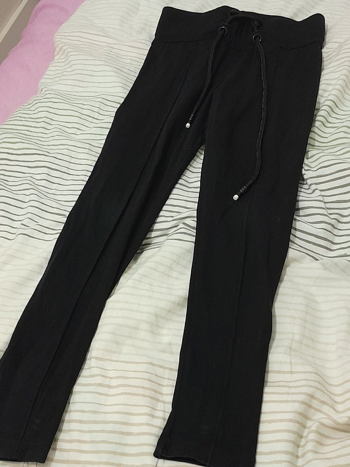 siyah, dar kesim ve yırtmaç detaylı, bağcıklı bel kumaş pantolon. Günlük şıklık için uygun, sentetik kumaştan.