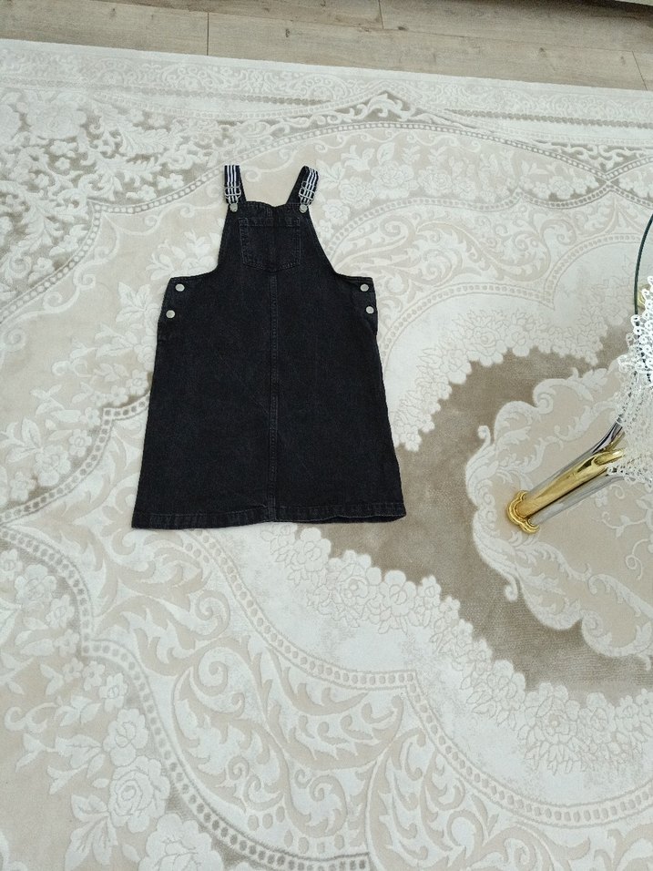 Kız çocuklar için fitted kesim siyah denim askılı elbise, kolsuz ve tokalı askılarla sokak tarzına uygun, desensiz.alınan üründe iade yoktur
