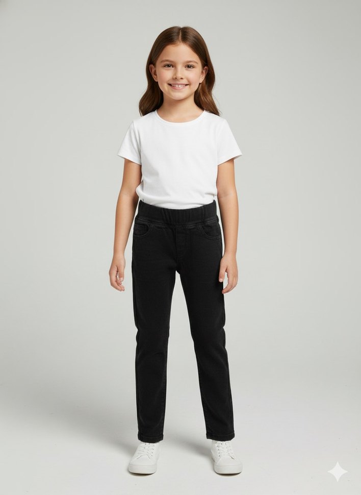 Kız çocukları için siyah denim pantolon, regular fit ve desensiz sade tasarıma sahiptir. Trendy, rahat ve zahmetsiz şıklık sunar.