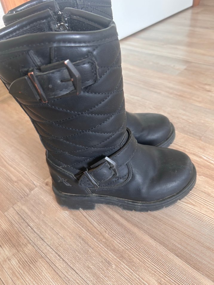Kız çocukları için siyah deri biker botlar, tokalı kayışlar ve kapitone detaylarla trend görünüme sahip. Bir sezon bile dogru düzgün kullanılmadı tertemizdir