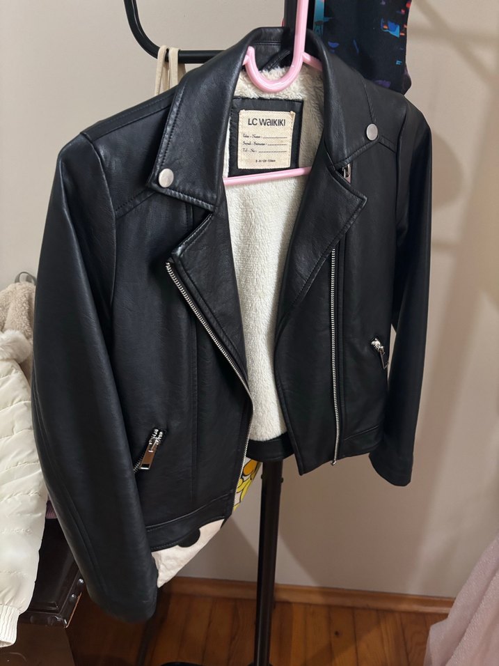 Siyah deri, fitted biker ceket, notched lapel ve fermuarlı detaylara sahip. Uzun kollu, baskılı deseniyle günlük kullanıma uygun. İçi kürklüdür.Çok severek kullandık. 8-9 yaş geçiyor.En ufak soyulma dökülme yoktur.Gönül rahatlığıyla alınabilir.