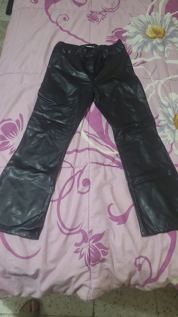 Siyah deri, regular fit ve midi boyda olan bu kadın pantolonu, tokalı detaylara sahiptir ve günlük sokak stili için uygundur. hiç giyilmedi