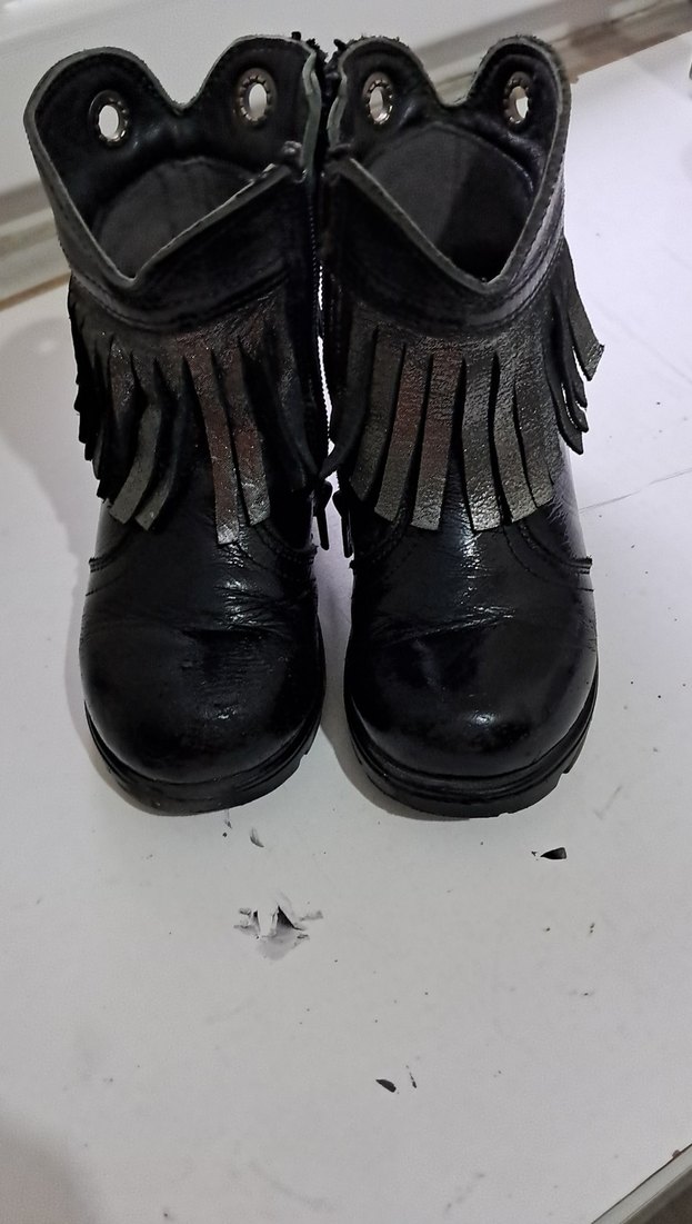 Siyah deri kız çocuk botları, kayışlı ve gri püskül detaylarıyla gotik tarzda, rock punk havası taşıyor. pahalı bir mağazadan alınmış güzel bir. botfitimdwn kaynaklı ufak tefek cizikler mecburen mevcut resimleri yaklaştırır basılabılırsi z