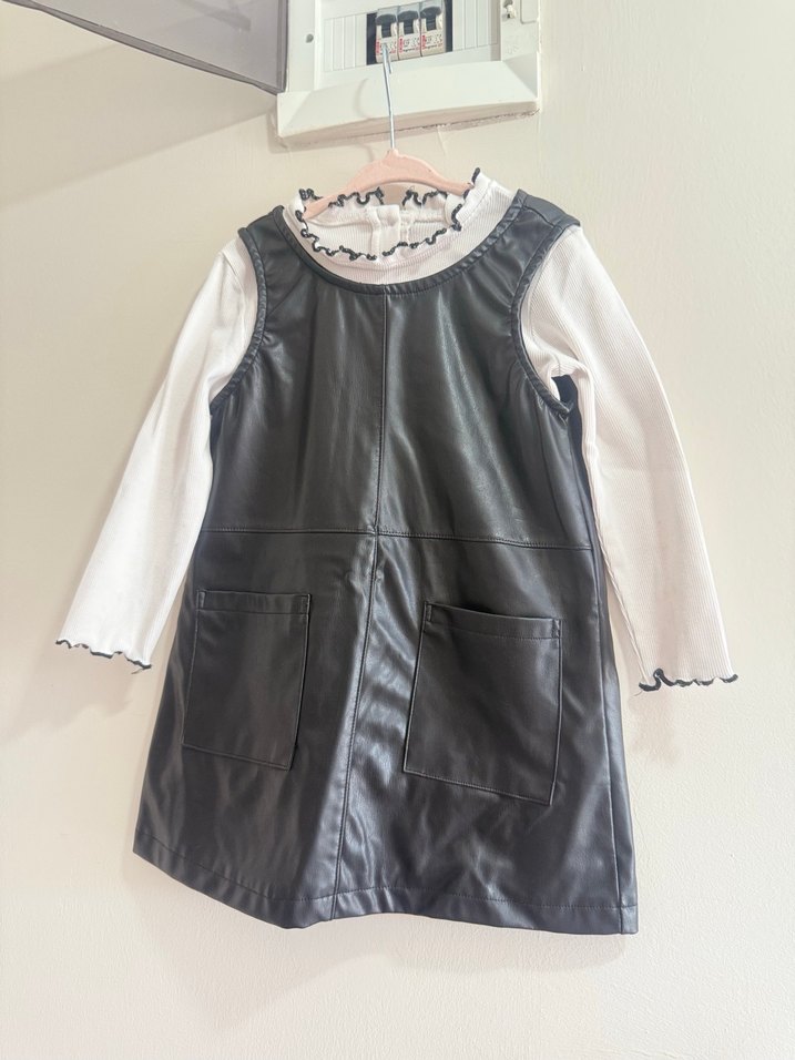 Kız çocuklar için siyah deri, yüksek yakalı ve uzun kollu, kemerli, iki cepli dar kesim elbise. Beyaz fırfırlı uzun kollu bluz ile kombinlenmiştir.