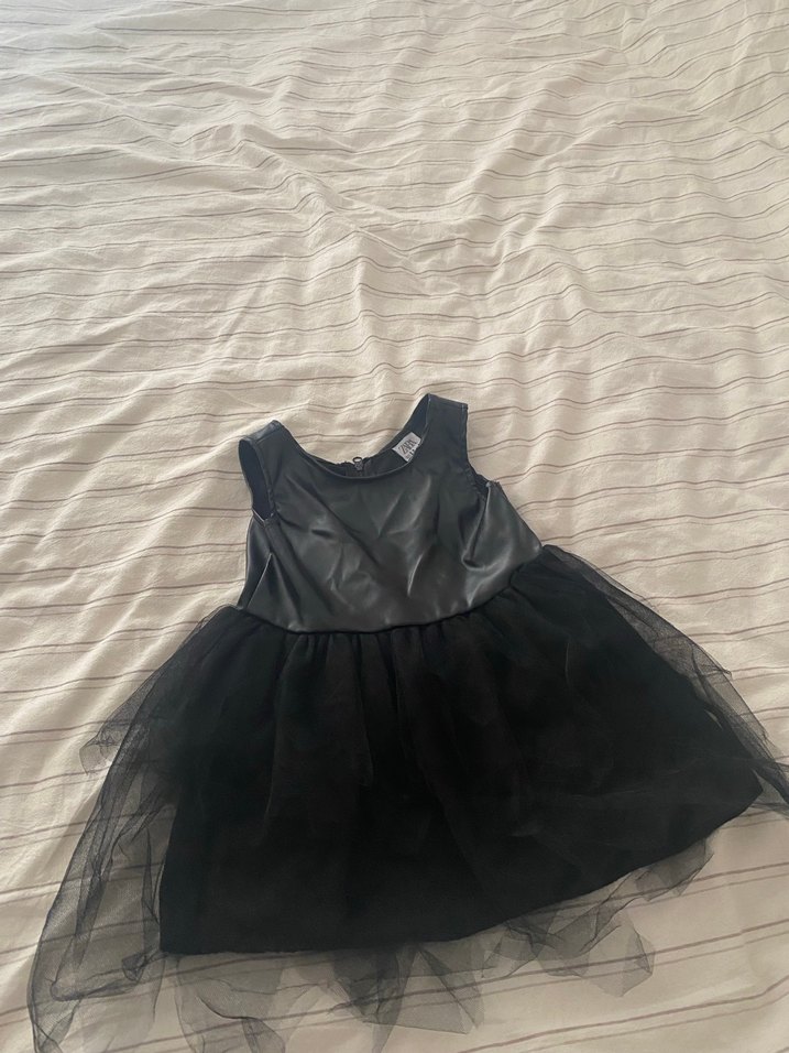 Deriden yapılmış, kolsuz ve fitted üst kısmı ile siyah kız çocuk elbisesi. Volanlı tül etek detayıyla şık ve gotik tarzda.