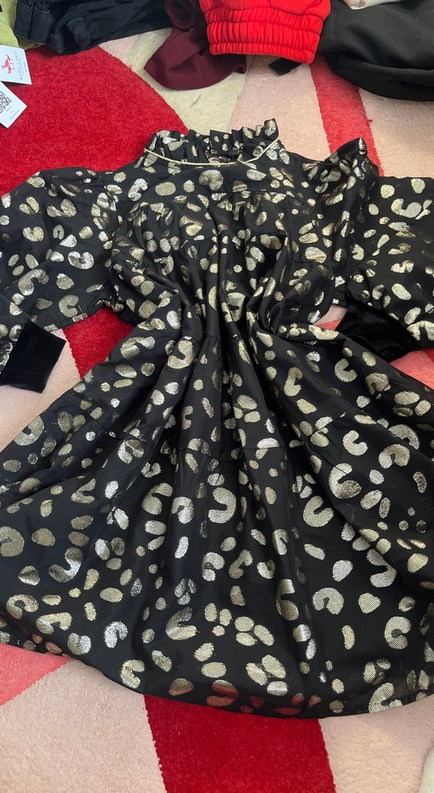 Yüksek yakalı, askılı ve bol kesimli siyah kız çocuk elbisesi. Fırfırlı detaylı, desenli ve sentetik kumaştan yapılmıştır, gotik tarzda şık bir seçim. Marka temsilidir