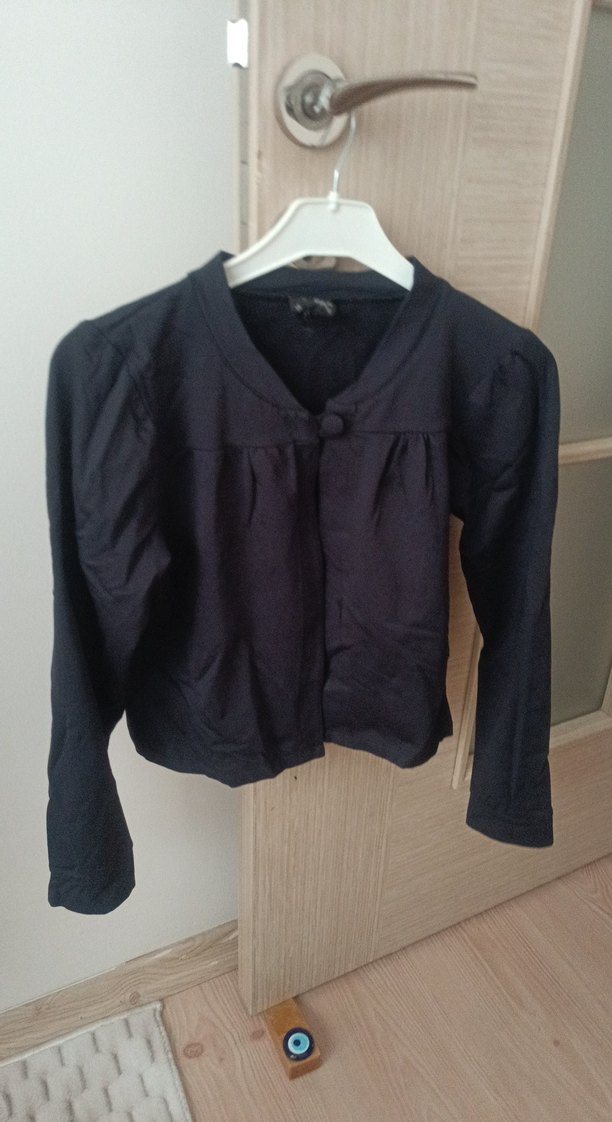 Uzun kollu, düğmeli siyah kız çocuk bolero. Yuvarlak yakalı, bol kesim ve yumuşak, sıcak kumaştan. Trendy casual gotik tarzına uygun.