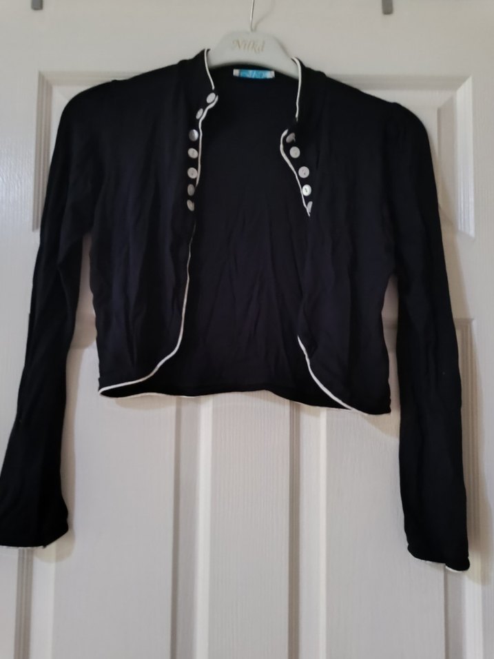 Kız çocukları için siyah, düğmeli, uzun kollu, yüksek yakalı ve dar kesim bolero. Yumuşak ve sıcak kumaştan üretilmiştir.