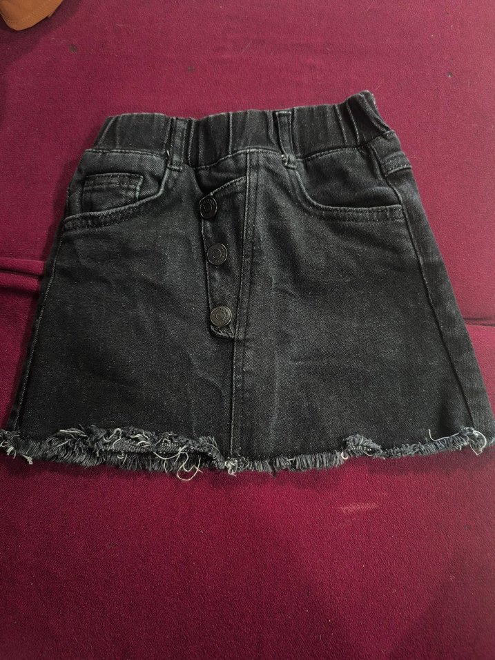 Bu siyah denim kız çocuk eteği, ön düğmeler ve yıpranmış etek ucu ile bol kesim sunar, gündelik gotik tarzındadır.