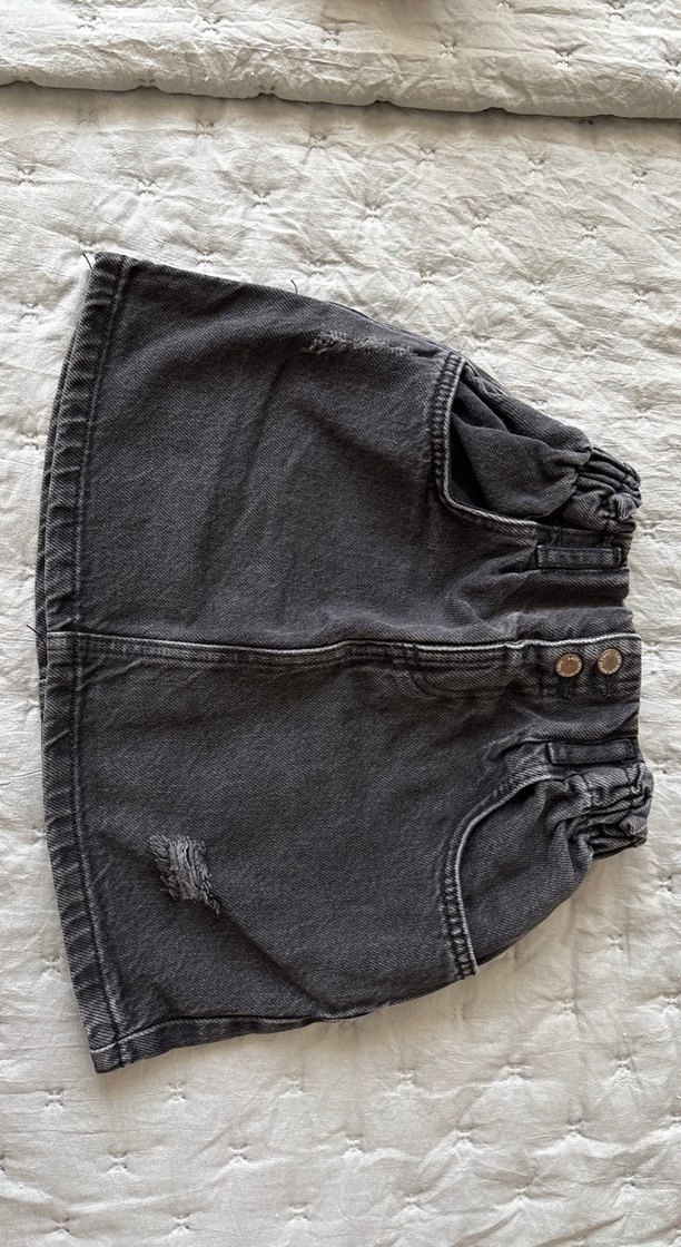 Düğmeli ve hafif yıpratma detaylı, bol kesim siyah denim kız çocuk eteği, rahat sokak stili için uygundur.