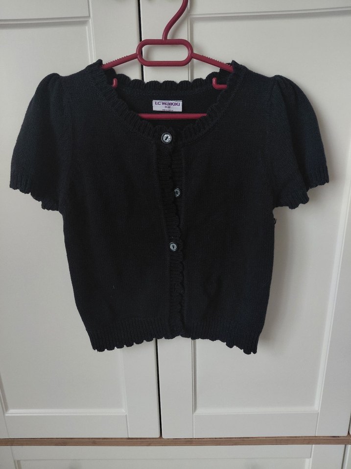 Kız çocukları için siyah, düğmeli, kısa kollu, yuvarlak yakalı ve fitted kesime sahip bolero. Örme kumaştan yapılmış, goth tarzında, desensiz tasarım.