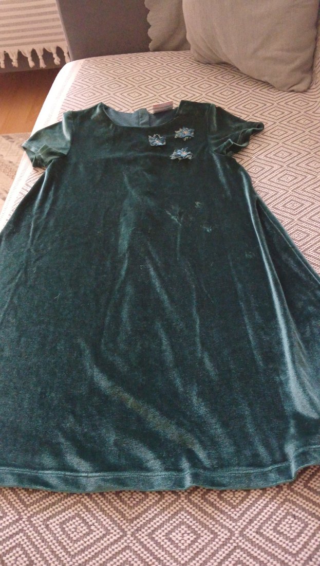 Siyah kız çocuk elbise, kısa kollu ve yuvarlak yakalıdır. Düğme detaylı, bol kesim ve yumuşak sentetik kumaştan üretilmiştir.