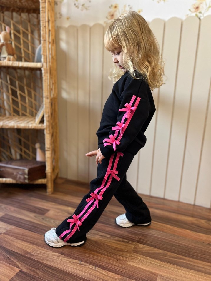 Yumuşak üç ip kumaştan, yanları canlı pembe şerit ve fiyonk detaylı, bol kesim siyah kız çocuk eşofman altı. Sokak modasına uygun.