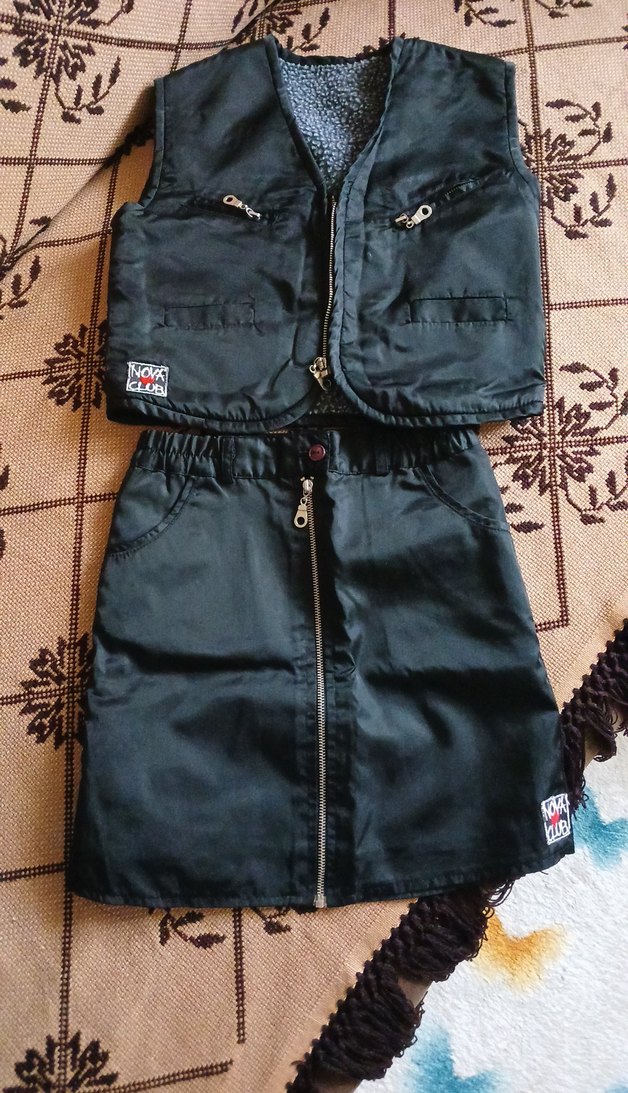 Siyah kolsuz yelek ve etek takımı, fermuarlı cepler ve notlu yakasıyla, yumuşak ve rahat kumaştan üretilmiştir. Trend sokak stili için uygundur.
