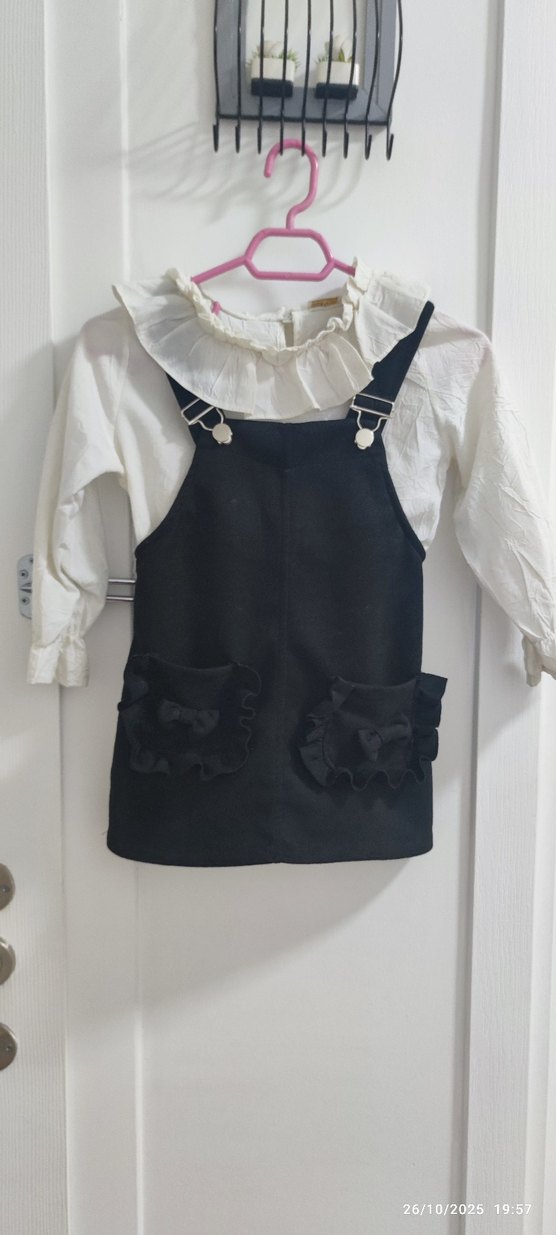 Kız çocukları için askılı, bol kesim siyah elbise, fırfırlı cepler ve ayarlanabilir askılarla. Üzerinde beyaz, fırfırlı yuvarlak yaka uzun kollu bluz bulunur. Rahat ve şık goth tarzı.