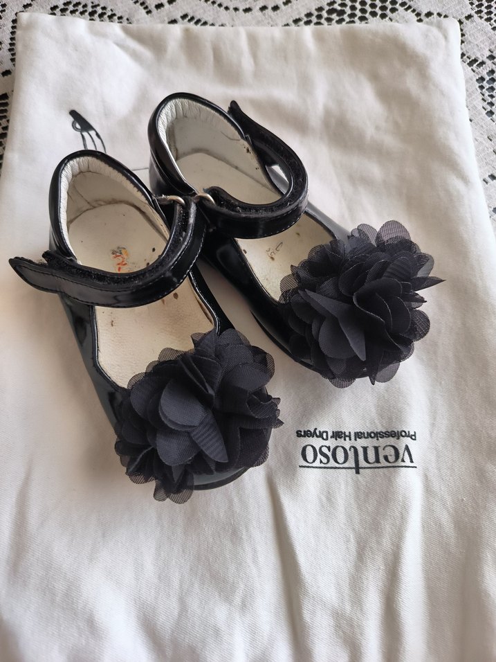 Siyah renkte, fırfırlı çiçek detaylı kız çocuk bale ayakkabısı, kauçuk tabanlı ve gotik stil ile klasik zarafeti birleştirir. ufak tefek çizik var. ortapedik babet.