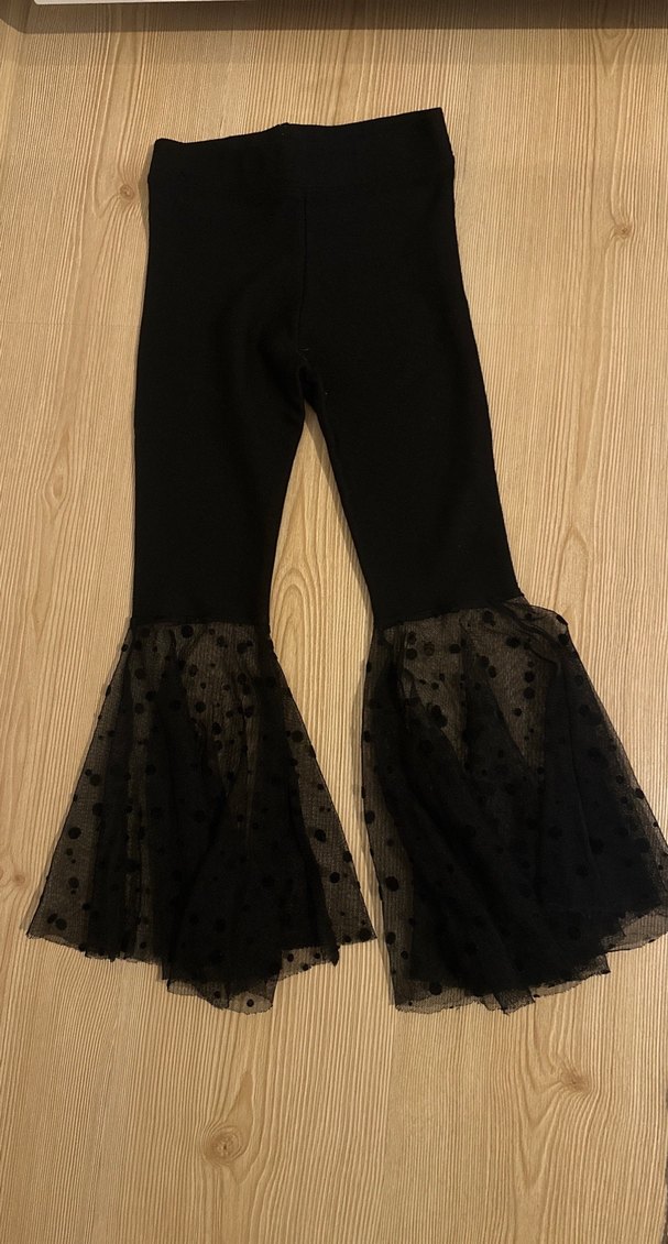 Kız çocukları için siyah, dar kesim pantolon. Paçalarında fırfırlı tül detaylarıyla gotik ve bohem tarzı bir arada sunar. Yumuşak sentetik kumaştan üretilmiştir.