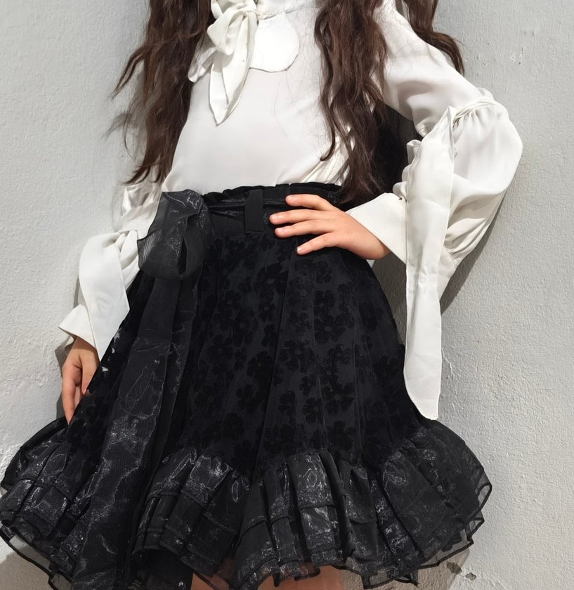 Kız çocukları için siyah gotik etek, bol kesim ve fırfır detaylara sahip, yumuşak sentetik kumaştan klasik ve zarif bir görünüm sunar.