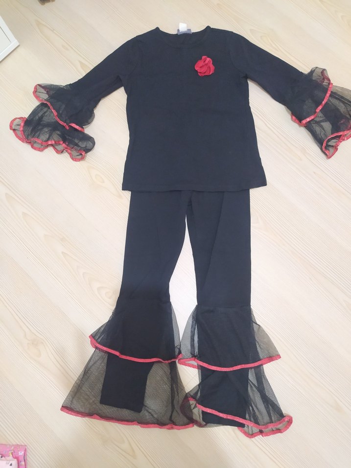 Uzun kollu, siyah İspanyol kol tül detaylı takım. Kollar ve pantolonlarda fırfırlı detaylar ve şerit süslemeler içerir. Kırmızı şeritli yumuşak kumaş.