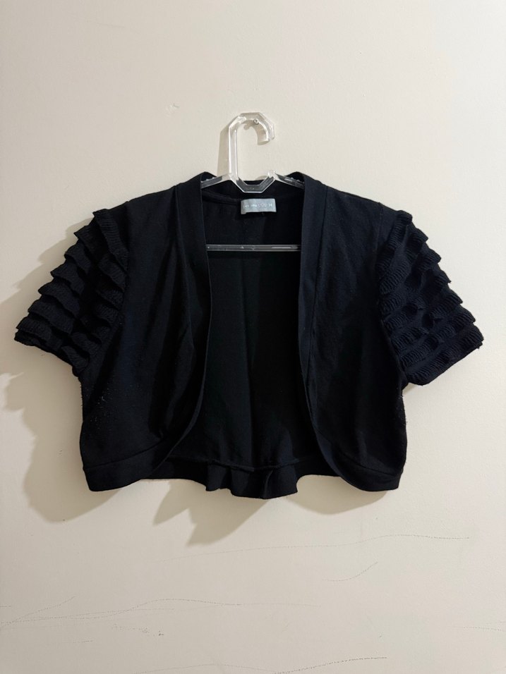 Kızlar için siyah, kısa fırfırlı kollu, yuvarlak yakalı, yumuşak örme kumaştan yapılmış dar kesim bolero. Gotik tarzda, trend ve avangart görünüm sunar.Ürün sayılı kullanılmıştır.Deformesi yoktur.