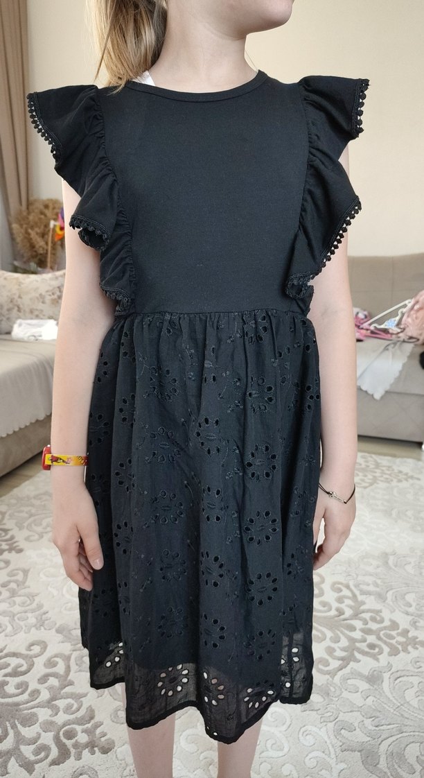 Kız çocukları için siyah, fırfırlı kısa kollu, nakışlı ve bol kesim elbise. Yumuşak sentetik kumaştan üretilmiştir.