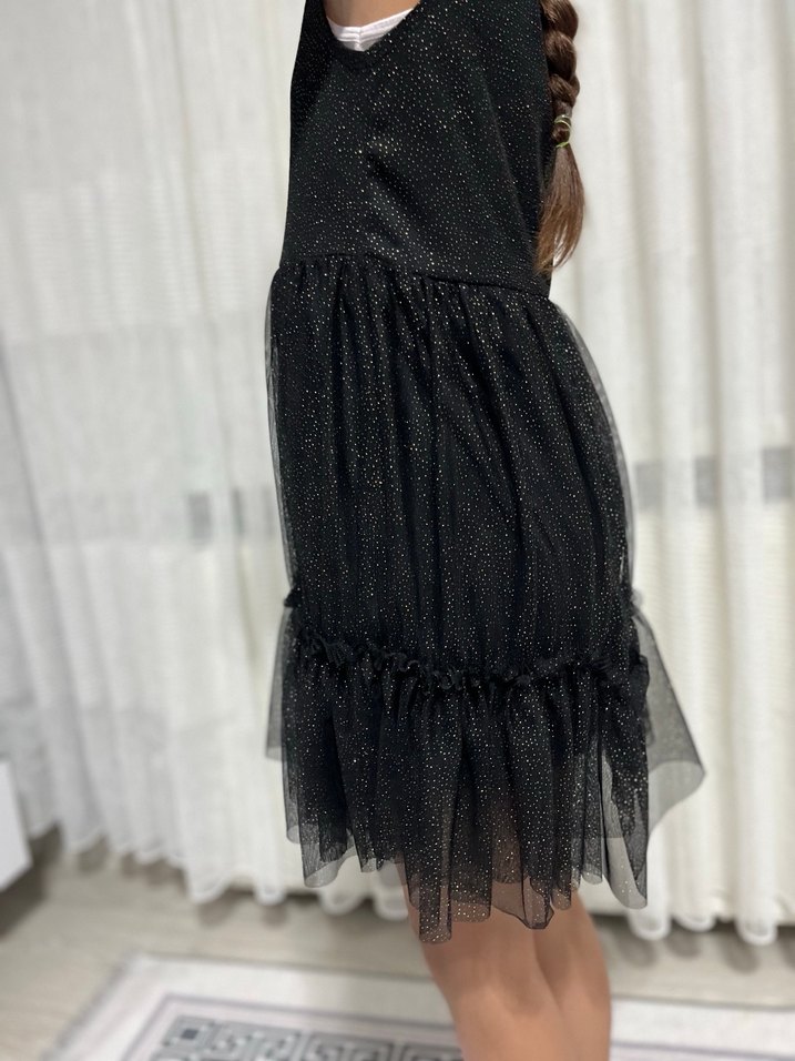 Kız çocukları için siyah goth tarzı, askılı ve fırfırlı detaylara sahip elbise. Yumuşak sentetik kumaştan, bol kesim ve yuvarlak yaka ile. ✨