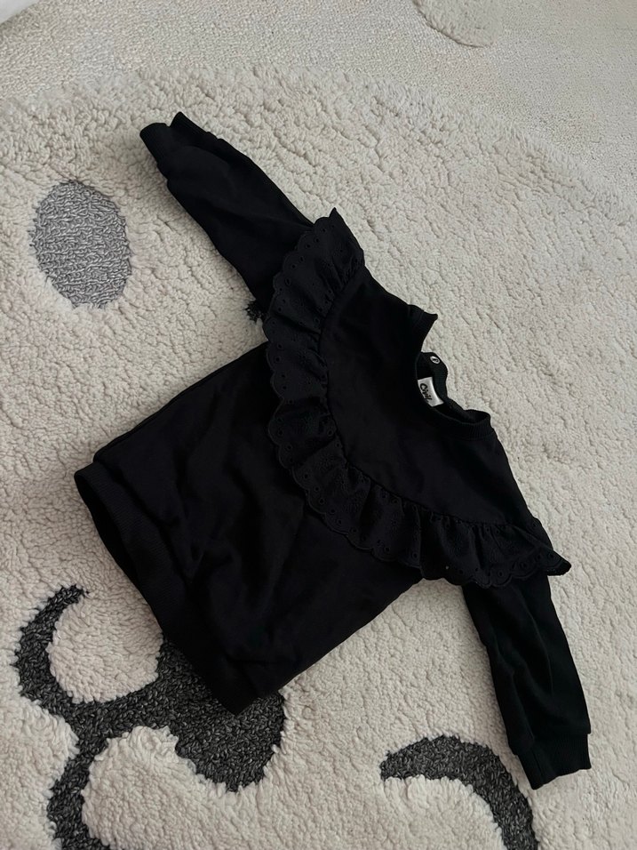 Siyah uzun kollu kız çocuk sweatshirt, yakalı ve fırfırlı detaylı. Rahat kesim, yumuşak ve sıcak kumaştan.Hiç giyilmedi.Etiketi mevcut değil.