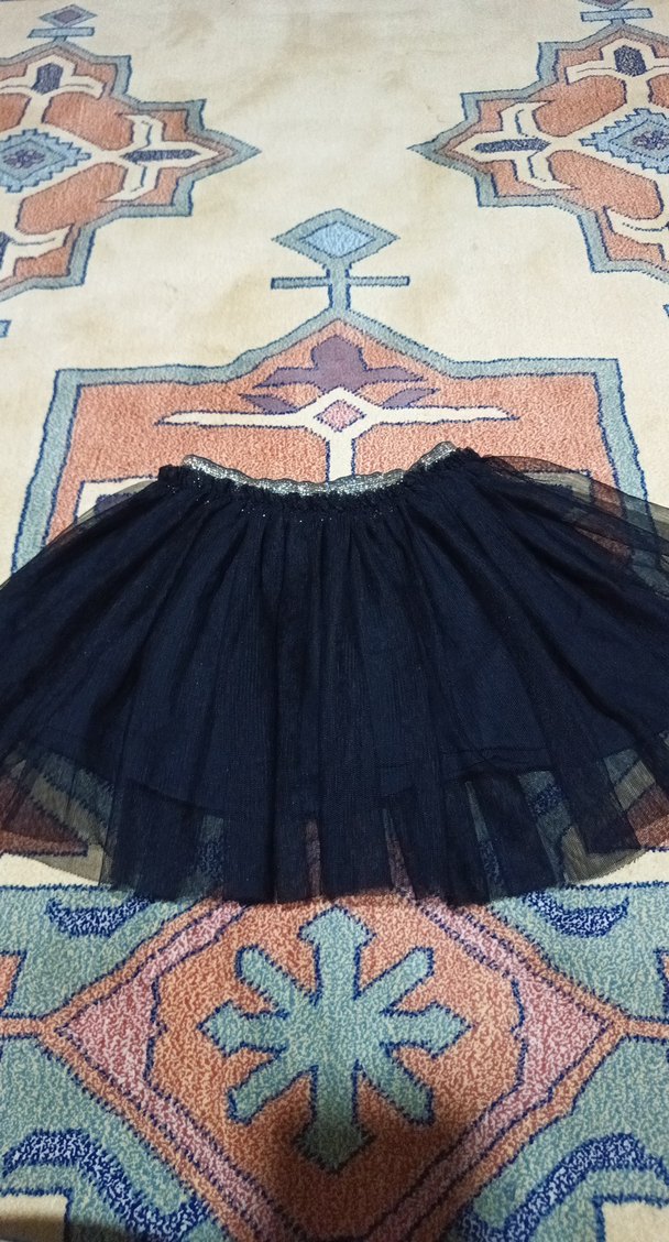 Siyah renk, yumuşak sentetik kumaştan yapılmış, bol kesim ve fırfırlı katmanlara sahip kız çocuk eteği. üstü tül altı kumaş bel lastiginde belli belirsiz arka kısmında sunme var