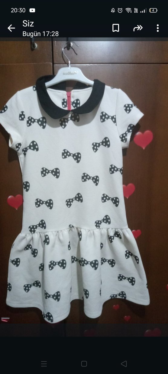 Kısa kollu, yuvarlak yakalı, siyah fiyonk desenli beyaz kumaştan, siyah yakalı ve fiyonk detaylı kız çocuk elbisesi. Trend sokak stili için uygun.