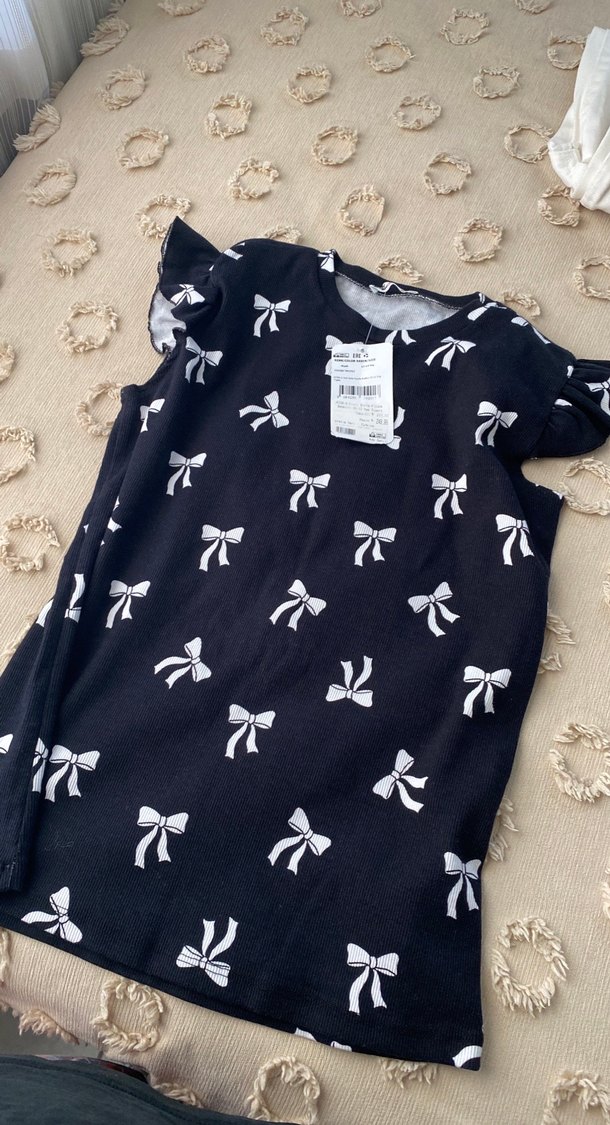 Kız çocukları için siyah, beyaz fiyonk desenli, kısa kollu, yuvarlak yakalı, bol kesim elbise. Yumuşak sentetik kumaştan üretilmiştir, günlük sokak tarzına uygundur.