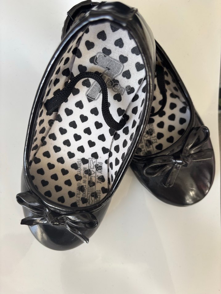 Kız çocukları için siyah fiyonk detaylı babetler, kalp desenli iç astar ve kauçuk taban ile.