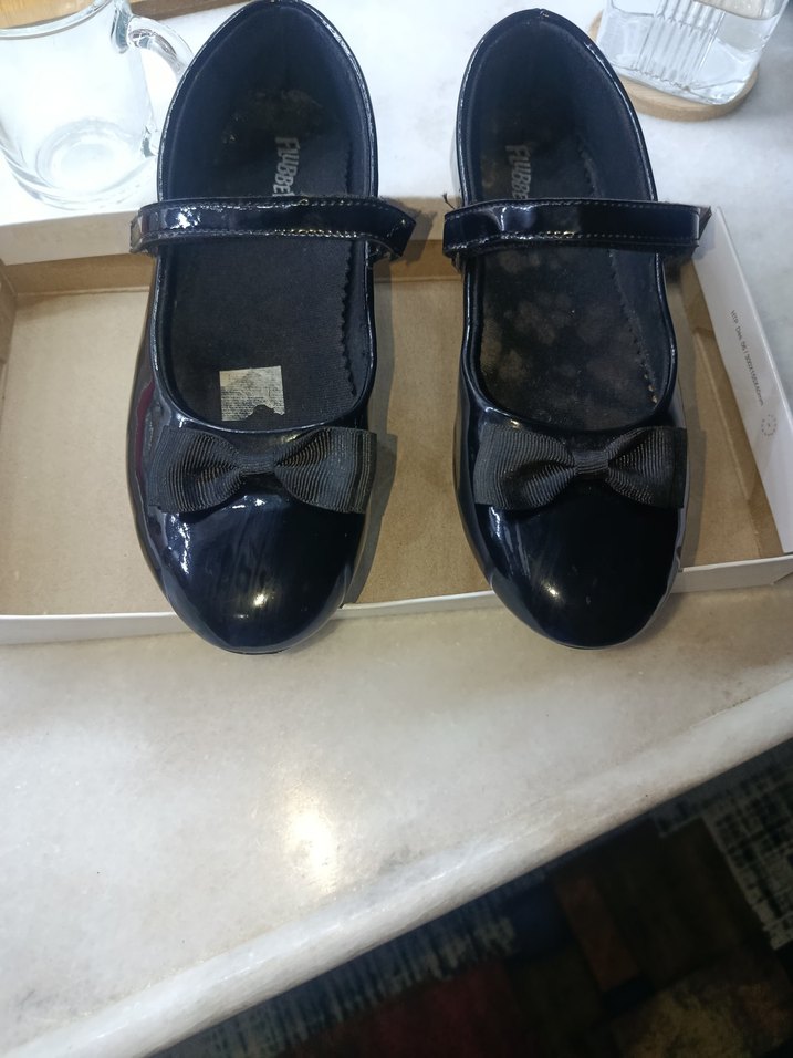 Siyah renkte, lastik malzemeden yapılmış kız çocuk babetleri, fiyonk detayı ve gotik klasik zarafet tarzıyla. Parlak yüzeyli ve üstte bantlıdır.