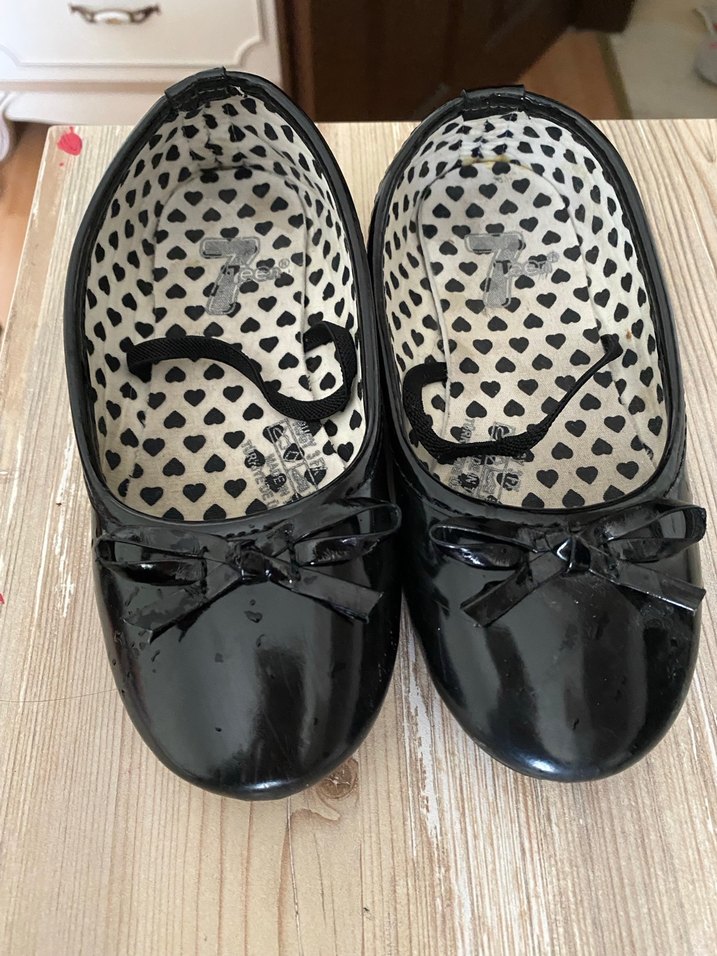 Kız çocukları için siyah lastik babetler, fiyonk detayı ve kalp desenli iç taban ile. Gotik tarzda, farklı bir görünüm sunar.
