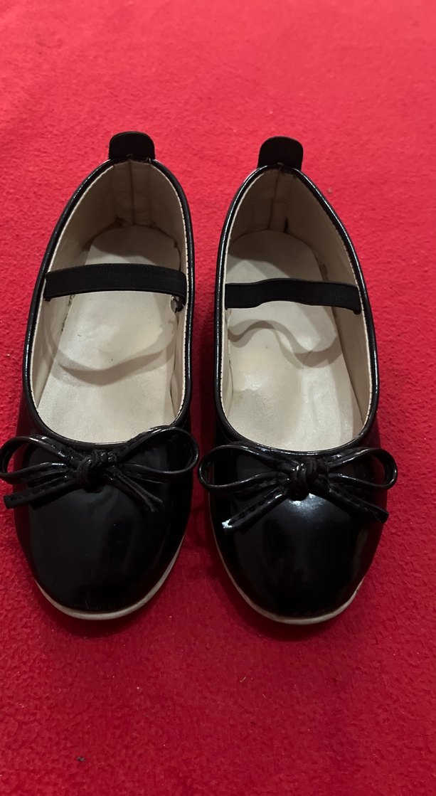 Siyah parlak yüzeyli kız çocuk babetleri, fiyonk detaylı ve elastik bantlıdır. Kauçuk malzemeden yapılmış, klasik goth tarzında.