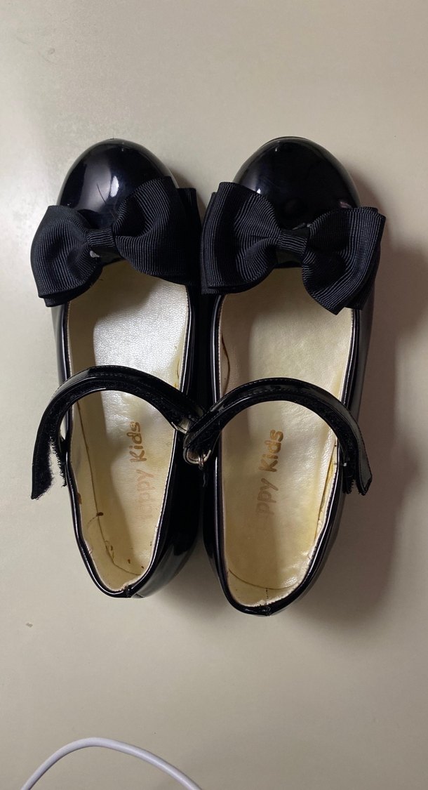 Sağlam. Siyah parlak yüzeyli kız çocuk babeti, büyük fiyonk detayı ve kauçuk tabanlı, gotik tarzda.