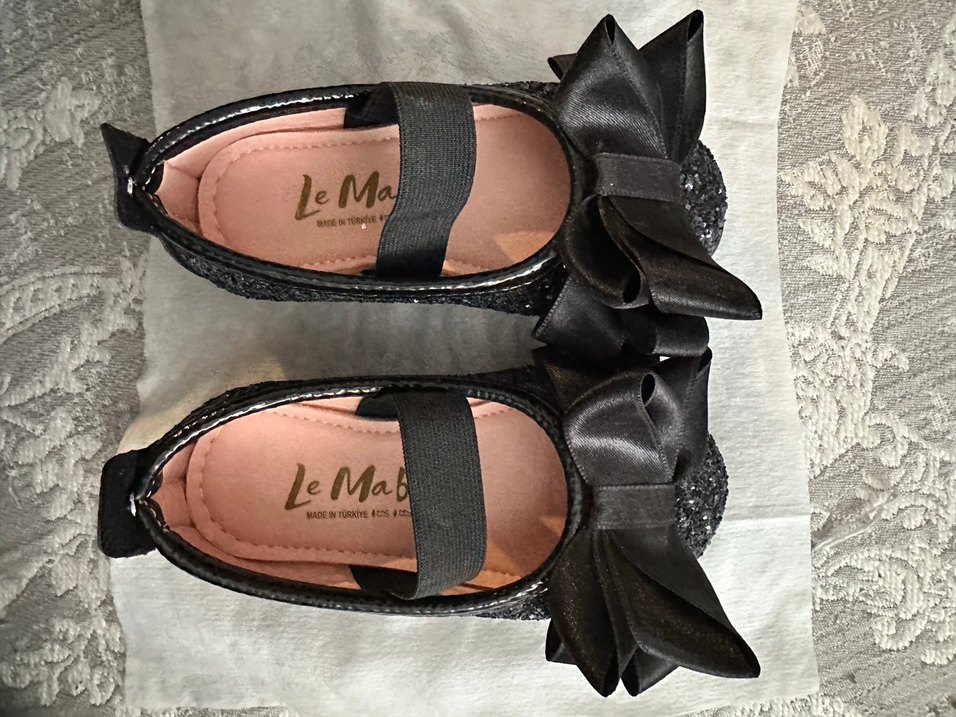 Siyah renk, baskılı desenli kız çocuk babeti. Lastikli ve fiyonklu, kauçuk malzemeden. Gotik tarzda, LeMat markalı.