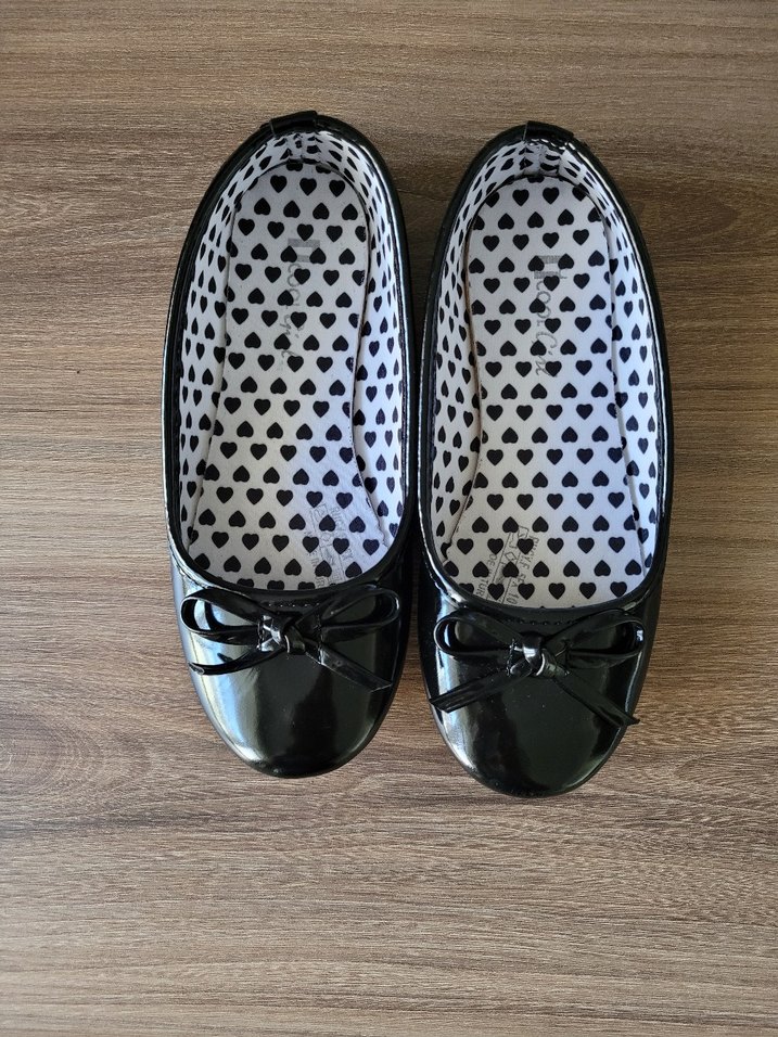 Siyah parlak yüzeyli kız çocuk babeti, fiyonk detayı ve kalp desenli iç astar ile kauçuk tabanlıdır.