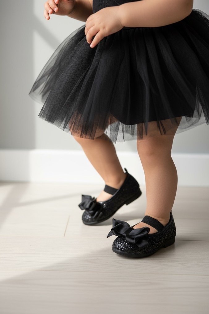 Kız çocuklar için siyah renkli, lastik tabanlı ve fiyonklu babet ayakkabı. Klasik gotik tarzda, desensiz ve şık görünüme sahip.