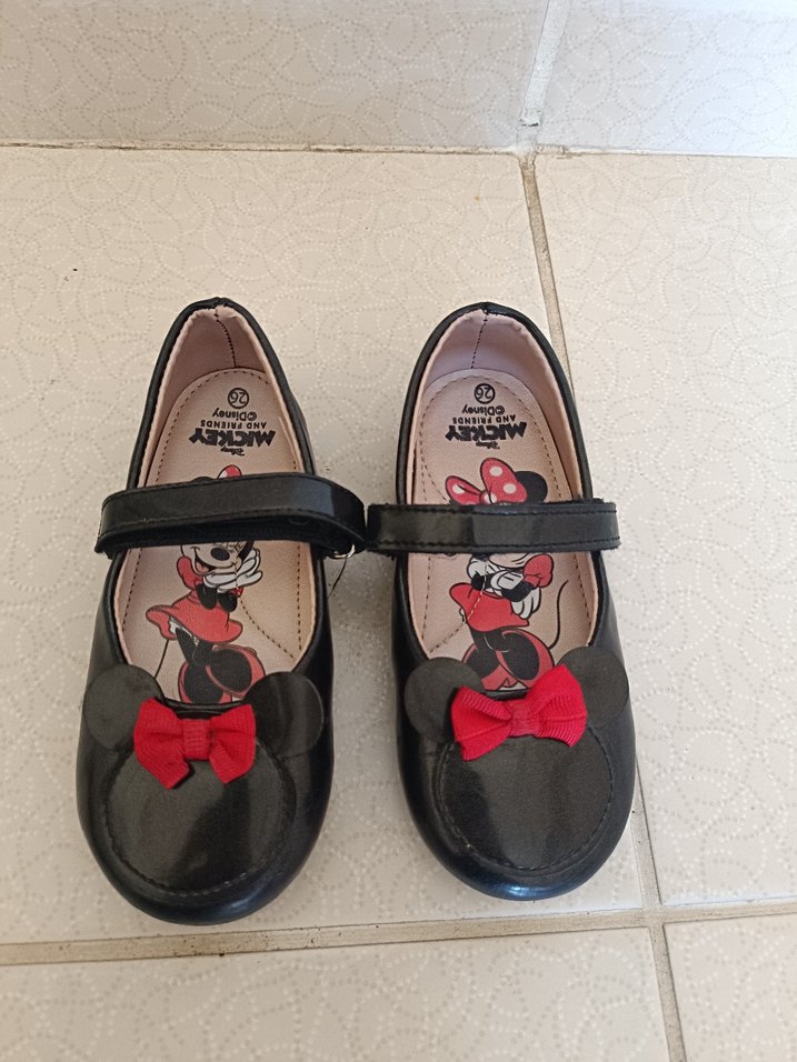 Siyah kız çocuk babet ayakkabılar, içinde Minnie Mouse baskısı bulunan kauçuk malzemeden yapılmıştır. Kırmızı fiyonk ve bantlı, trend sokak stili için uygundur.