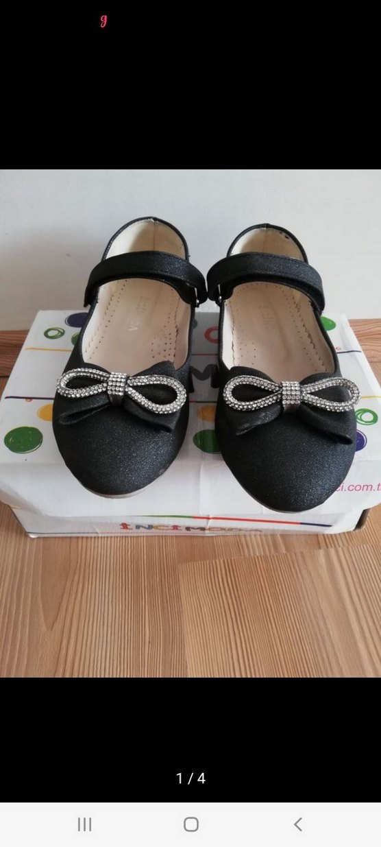 Kız çocukları için siyah babet ayakkabılar, taşlı fiyonk ve bant detayına sahip, kauçuk malzemeden, hafif desenli. Klasik gotik tarz için uygun.